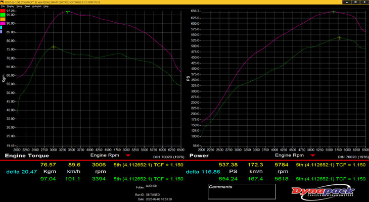 2Lターボ車両ですが、ブースト圧、各リミッター変更、カットを行い、ダイナパックTCF 1.15にて400PSオーバーになりました。